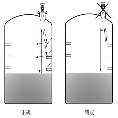 容器內的裝置,比如:梯子等都會造成虛假回波。在設計安裝位置時不能有任何裝置阻擋雷達信號的運行。