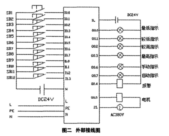 為實現液位的手動/自動控制,本人實驗機型是采用“西門子”公司制造的S7-200型編程器,主要參數如下:需要輸入點10個,輸出點7個,選用西門子S7-200 17點I/O單元的PLC,輸入光電隔離,輸出繼電器隔離,負載能力強,自備電源24V。液位檢測采用干簧管傳感器檢測,液位設定采用雙位旋鈕,系統具有手動啟泵、停泵和確認按鈕;輸出選用電子音響報警器和24V直流指示燈、繼電器。參見圖二系統外部接線圖。