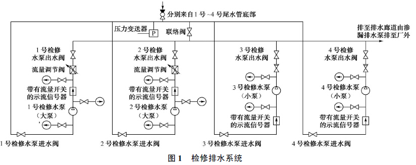 桐柏電站的檢修排水系統, 共設4 臺排水泵, 如圖1 所示, 1 號、2 號檢修水泵(大泵)用于排空引水隧洞、蝸殼、尾水管、尾水隧洞內的水;3 號、4 號檢修水泵(小泵)用于球閥、上下庫閘門等的滲漏排水。每臺檢修水泵均配置逆止閥、壓力表和帶流量開關的示流信號器, 在1 號、2 號水泵出水管處各安裝了一個流量調節閥。系統中共有2 根總管, 一根為水泵的總吸水管, 包括從每臺機組尾水管底部至總管的支管, 總吸水管和部分支管及管路上的操作閥門布置在廠房管路廊道中;另一根為總排水管, 可將水排至滲漏集水井中, 再經滲漏排水泵排至下庫。