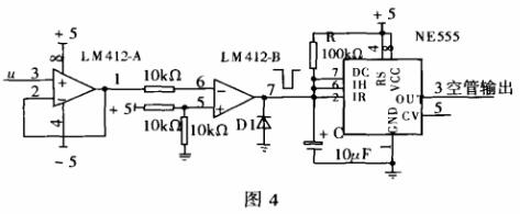 為了排除以上干擾,設(shè)計了一個檢測電路(見圖4)。整個檢測電路由跟隨器、比較器、定時器組成。跟隨器的作用是將檢測電路與儀表的其他電路隔離,防止檢測電路對信號u產(chǎn)生影響。比較器電路的正向輸入端接2.5V的電壓,當(dāng)傳感器管路不是空管時,由于信號u,ZUI大值不超過0.5V,所以比較器的輸出始終為高電平;當(dāng)傳感器管路為空管時,比較器輸出一序列的方波信號。二極管D1為方波信號的負(fù)電壓提供回路。由NE555構(gòu)成的通用定時器電路的工作原理是:當(dāng)輸入觸發(fā)信號電平低于電源電壓的1/3時,內(nèi)部比較器開始工作,觸發(fā)電路觸發(fā),內(nèi)部的放電晶體管斷開,電容C被充電。充電電壓超過電源電壓的2/3時,內(nèi)部比較器再次工作,放電晶體管把電容C中積蓄的電荷放掉,然后等待下次觸發(fā),輸出脈沖寬度由T=1.1×C×R確定,脈沖寬度ZUI長可達(dá)數(shù)十秒。