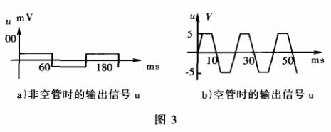 當(dāng)傳感器不是空管時,由于比較器電路始終輸出高電平,不能觸發(fā)定時器工作,定時器輸出為低電平。而傳感器為空管時,比較器的輸出脈沖不斷地觸發(fā)定時器,若T大于20ms時,定時器的輸出信號始終為高電平。因此,單片機(jī)只要通過檢測定時器的輸出信號,便可知道是否為空管。