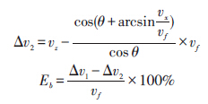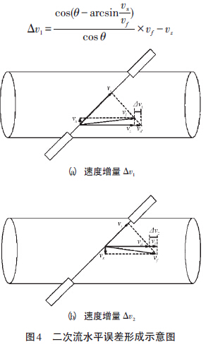 二次流水平速度(X 方向的分速度)直接影響了超聲波流量計的軸向檢測平面,對檢測造成了非常大的影響。聲道線在空間上先后收到方向相反的二次流水平速度的作用,這在很大程度上削弱了誤差。但反向速度并不完全相等,且超聲波流量計是按固定角度進行速度折算的,超聲波傳播速度vs 對應地固定為軸向流速為vd ,而其真實流速為vf ,由此二次流徑向兩個相反的水平速度,分別導致了Δv1(如圖4(a)所示)和Δv2(如圖4(b)所示)兩個速度變化量,其中Δv1 導致測得的流速偏大,Δv2 導致測得的流速偏小,兩個誤差不能抵消,產(chǎn)生二次流的水平誤差Eb :