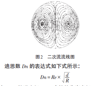 流體流經(jīng)彎管,管內(nèi)流體受到離心力和粘性力相互作用,在管道徑向截面上形成一對反向?qū)ΨQ渦旋如圖2所示,稱為彎管二次流。有一無量綱數(shù),迪恩數(shù)Dn 可用來表示彎管二次流的強度。當管道模型固定時,迪恩數(shù)Dn 只與雷諾數(shù)Re 有關。研究發(fā)現(xiàn),流速越大,產(chǎn)生的二次流強度越大,隨著流動的發(fā)展二次流逐漸減弱。