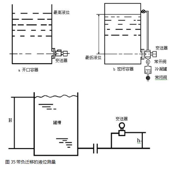 差壓式液位變送器安裝在流程接頭的上方則需要零位負遷移,。法蘭式液位變送器的安裝與使用見圖35。